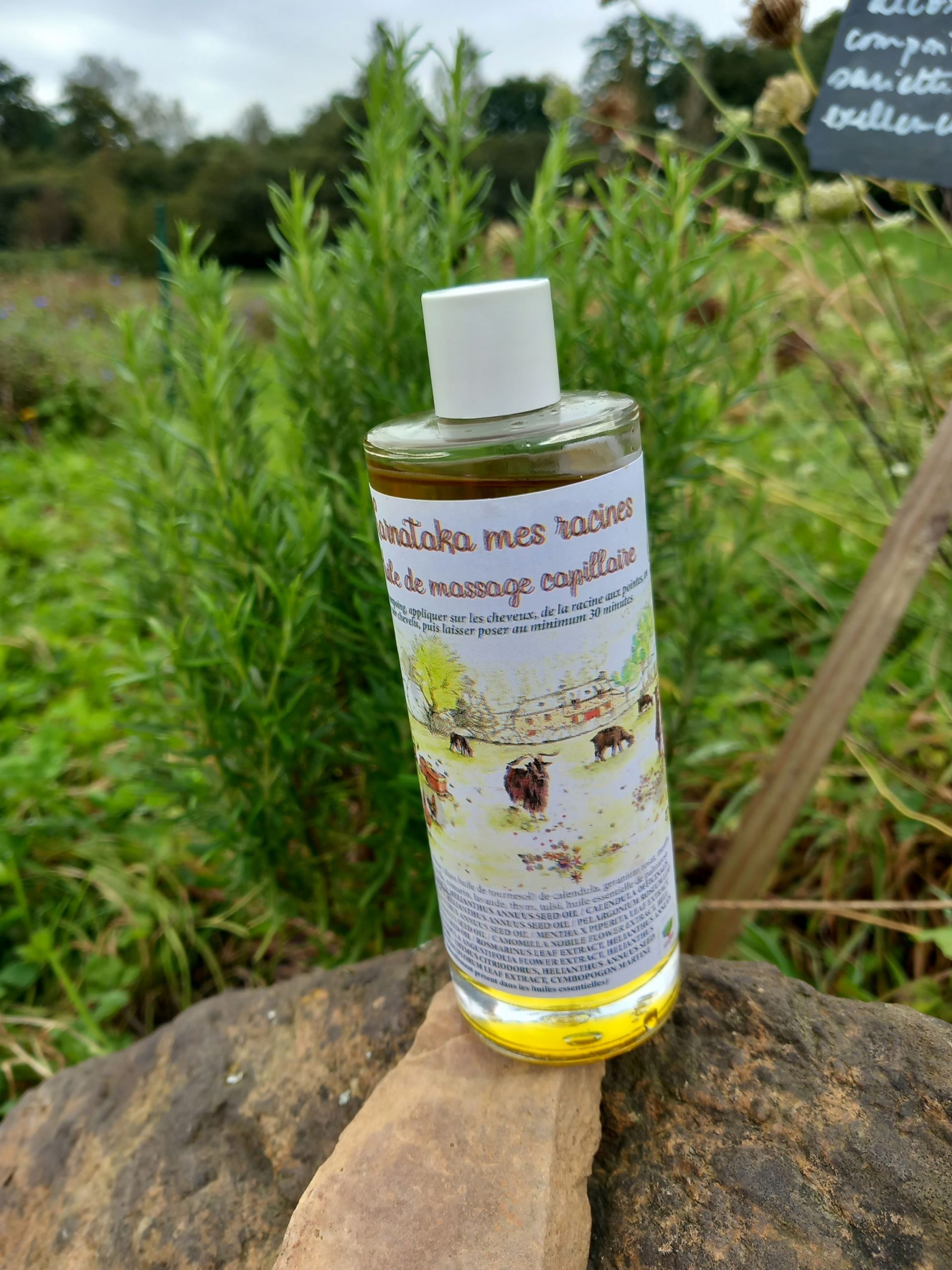À base d’huiles de macération solaire de calendula, géranium rosat, menthe poivrée, romarin, laurier, tulsi, capucine, thym citron, romaine et d’huile essentielle de lavande sauvage