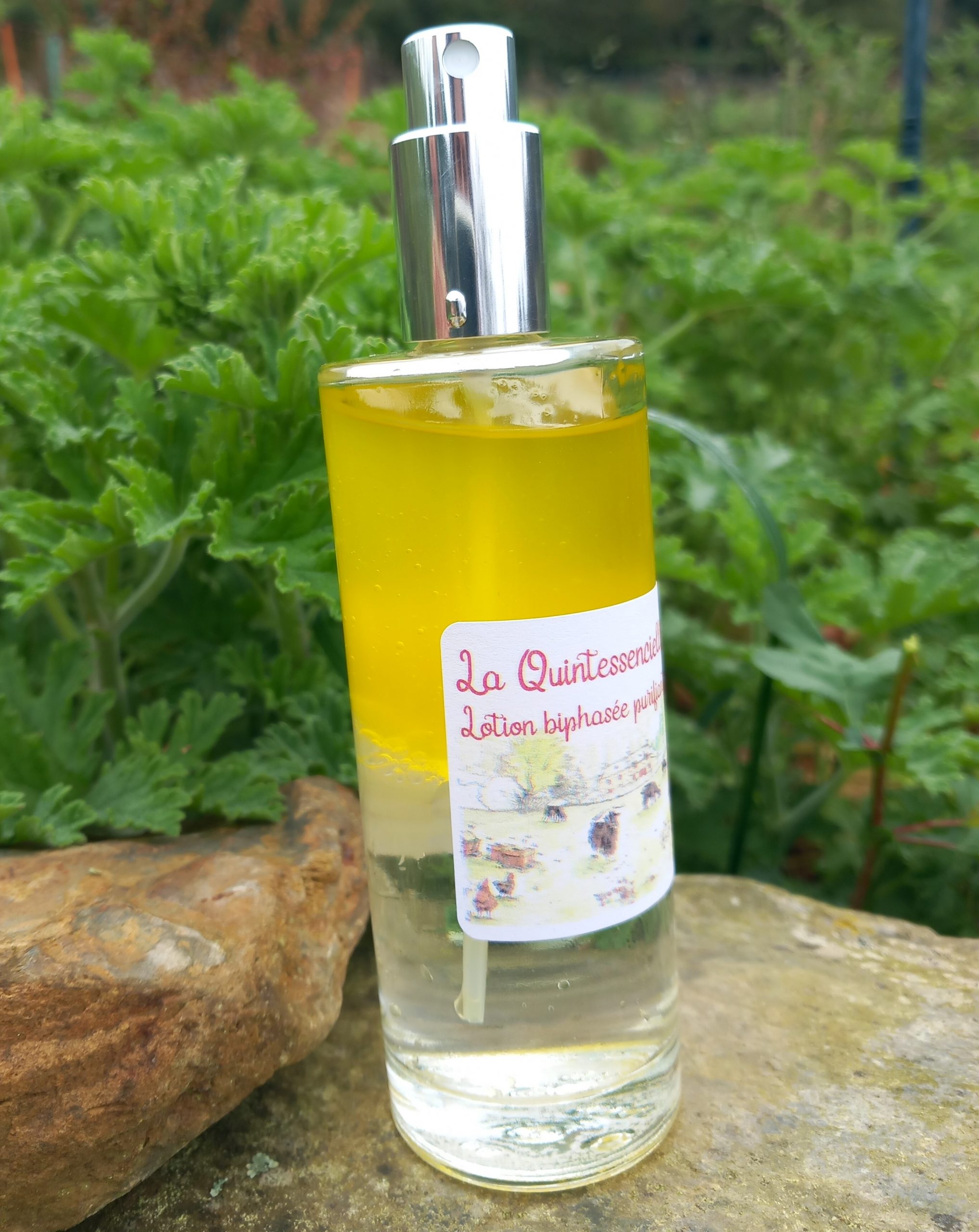 Lotion biphasée (huiles solarisées + hydrolat) purifiante et régulatrice pour le soin quotidien ou le démaquillage des peaux sensibles, irritées ou à problèmes
